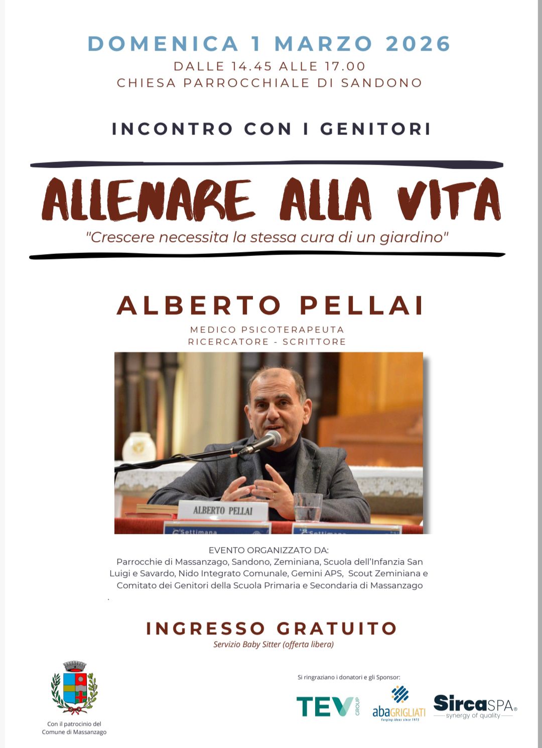 Domenica 1 marzo 2026, presso la Chiesa Parrocchiale di Sandono, si terrà l’incontro per i genitori “Allenare alla vita”, con il dott. Alberto Pellai, medico psicoterapeuta e autore di riconosciuta esperienza. L’evento rappresenta un’occasione per riflettere sull’importanza di crescere e prendersi cura dei propri figli con attenzione e dedizione, come un giardino da coltivare.